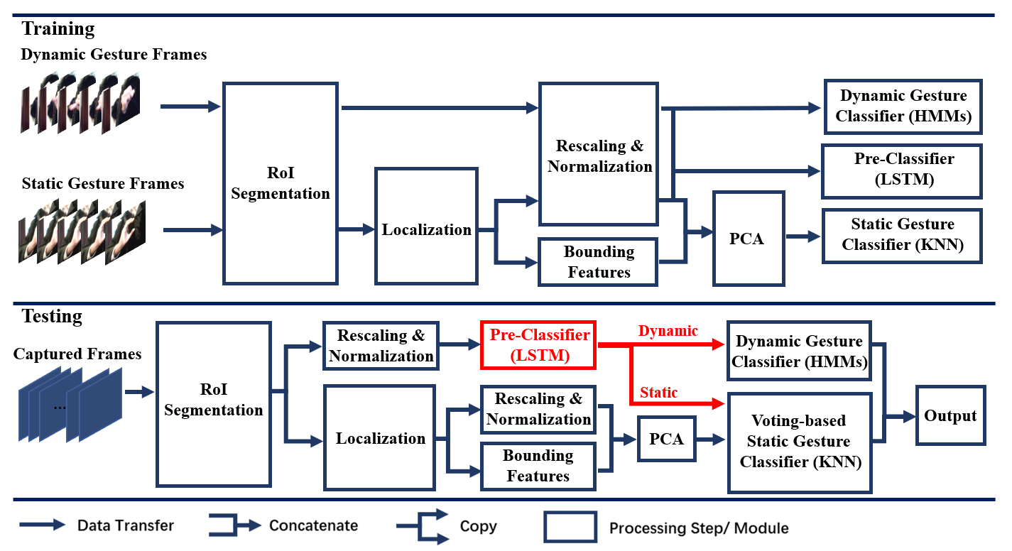 Majority of deaf-and-mute people use sign language produced by body actions such as hand gestures, body motion, eyes and facial expressions to communicate amongst each other and with non-impaired people in their daily life. However, it has become a barrier for mute and deaf communities which intend to integrate into society. Therefore, it is significant to have a medium that can recognize and translate gesture into understandable words by common people, as the information carried by hand gestures is always principal in sign language. To bridge the communication gap, a vision-based multimodal hand gesture recognition system for Sign Language Recognition (SLR) is proposed, which can recognize both static and dynamic gestures. As the core of the proposed system, 3 classifiers are trained and tested, i.e. dynamic gesture classifier implemented by 2 HMMs, static gesture classifier implemented by voting-based KNN and pre-classifier implemented by LSTM. Within the system, a faster and more efficient image cropping algorithm is proposed to eliminate the unwanted noise after applying skin color detection, which reduces the running time from 4.15s per sample to 0.03s per sample compared to the previous work. The experiment result illustrates that the proposed system achieves a promising performance with accuracy of 99.68% in recognition, testing on the self-built dataset with 12 classes of gesture in ASL, i.e. ‘A’, ‘B’, ‘C’, ‘D’, ‘E’, ‘F’, ‘G’, ‘H’, ‘L’, ‘U’, ‘J’ and ‘Z’, where ‘J’ and ‘Z’ are dynamic gesture and the rest gestures are static. In addition, this thesis compares and analyzes the performance and tuned parameters using various machine-learning-based and ANN-based classification models as the classifiers.