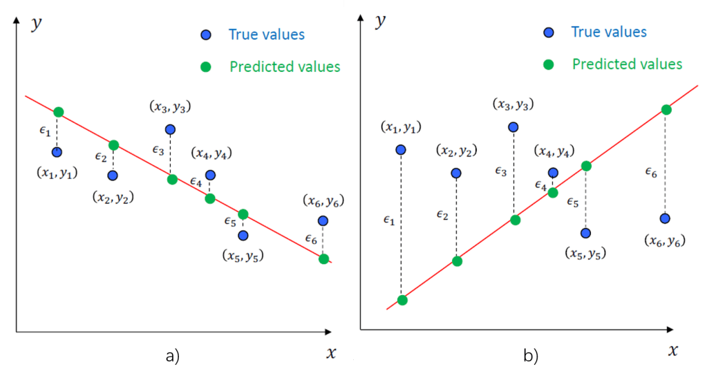 回顾上篇,我们如果想找到一个方法对狗剩所“盘算”的预测未来收入的一元线性回归模型进行评估,一个最凭直觉的标准就是衡量狗剩所拟合的直线和所有样本点的距离远近——一个好的模型应当能让所有样本点到直线距离的总和尽量地小,而差的模型这个距离总和则会比较大。图1. a) 和 b)能直观地展现这一点: