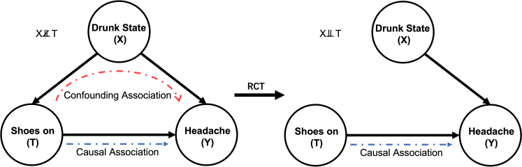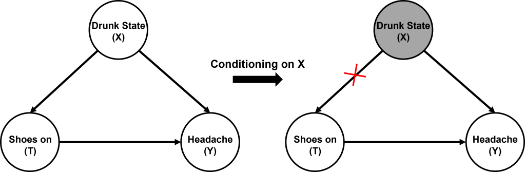 The answer is NO. Thanks to Pearl’s thoughts, do-calculus can help us continue to climb the ladder. Let’s go back to the example of “if sleeping with shoes on will lead to headache?” illustrated in last blog (Fig. 1). What RCT actually does here is to ensure the treatment (T) to be independent from the the confounder (X), that is . In Pearl’s causal language, the RCT blocks the causal path from the drunk state to shoes-on state.
